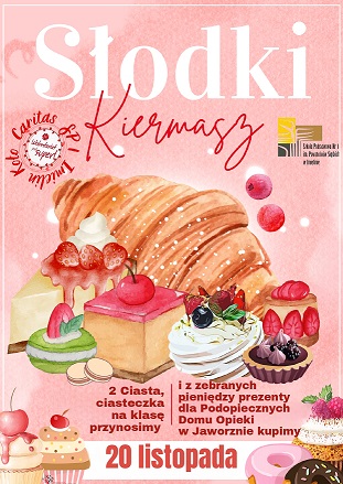 Szkolne Koło Caritas zaprasza, na SŁODKI KIERMASZ, który wspólnie zorganizujemy 20 listopada – w poniedziałek. Ciasta będą rozprowadzane na przerwach do godz. 14 50.
