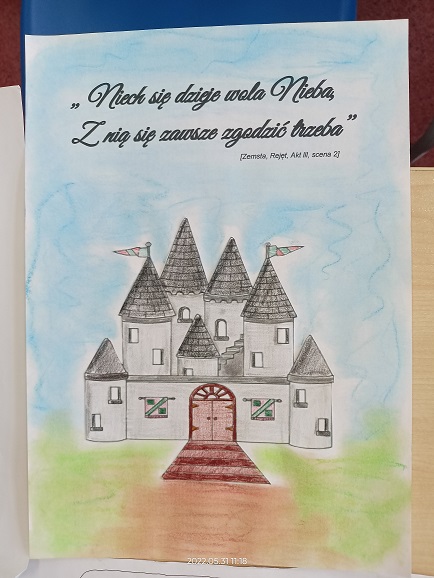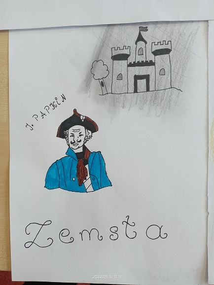 REALIZACJA PROJEKTU: Uczniowie wykonali plakaty promujące „Zemstę” Aleksandra Fredry. Utworzona została również dokumentacja w formie zdjęciowej. Uczennice: Marta Pacwa, Marta Bednarska, Antonina Skiba, Paulina Staniewska wygrały szkolny konkurs i w nagrodę otrzymały książki: Kasia Stoparczyk „Jak mieć w życiu frajdę”.